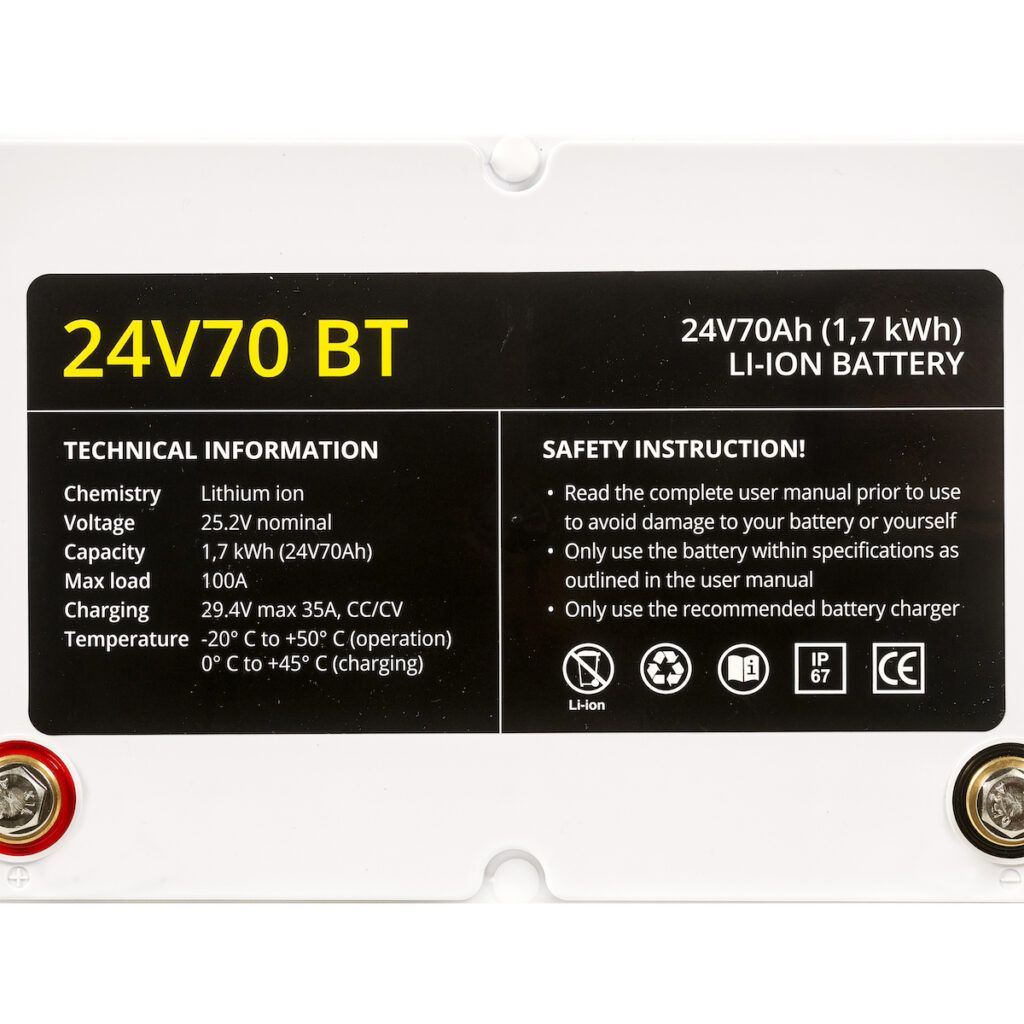 24V70 BT li-ion battery top view specs close-up