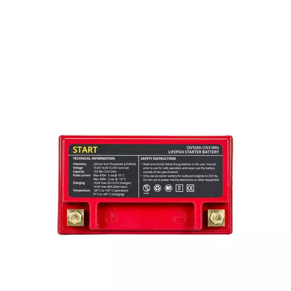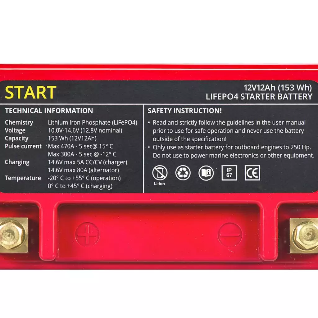 Ease of use: charges via alternator of outboard, protected by BMS. IP67 waterproof